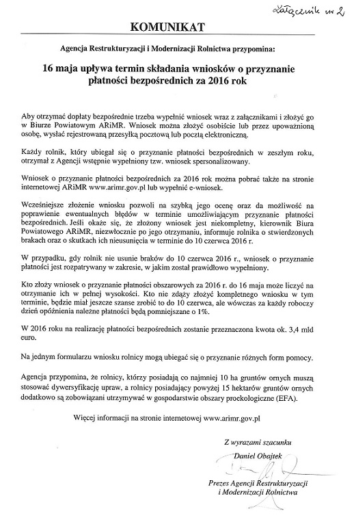 Publikujemy komunikat Prezesa ARiMR, dotyczący zbliżającego się upływu terminu składania wniosków o przyznanie płatności bezpośrednich za rok 2016.