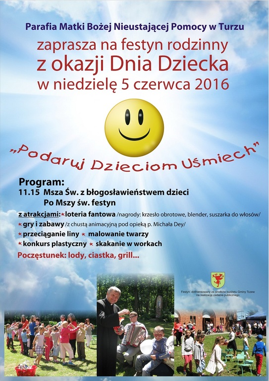 5 czerwca 2016 r. w Turzu odbędzie się festyn rodzinny z okazji Dnia Dziecka. Szczegóły na plakacie. Serdecznie zapraszamy do udziału!