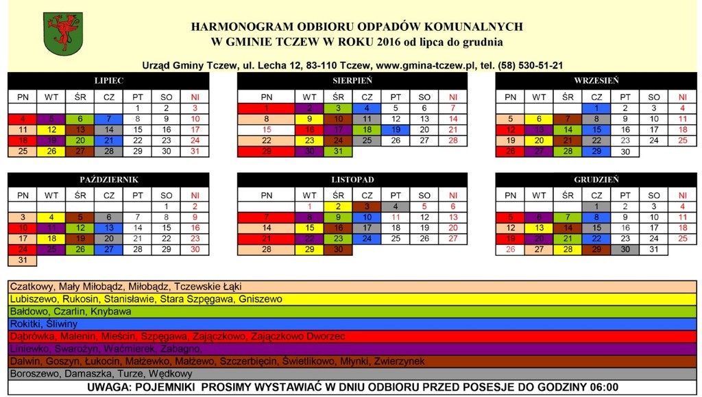 Harmonogram odbioru odpadów komunalnych w Gminie Tczew w roku 2016 od lipca do grudnia.