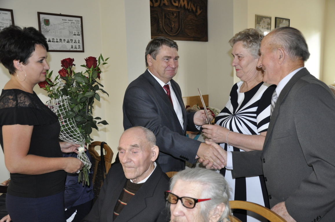 W ubiegły piątek w Urzędzie Gminy odbyła się uroczystość z okazji jubileuszu mieszkańców Gminy Tczew. Wójt Gminy Tczew Roman Rezmerowski zaprosił pary małżeńskie obchodzące 50-lecie, 55-lecie, 60-lecie, 65-lecie oraz 70-lecie pożycia małżeńskiego. Te wspólnie spędzone lata to niewątpliwie symbol wierności i prawdziwej miłości, który stanowi przykład dla młodych pokoleń, jak należy kroczyć wspólnie przez życie. Uhonorowani zostali również mieszkańcy gminy, którzy obchodzili 85 i 90 urodziny. Za dożycie tak pięknego i godziwego wieku należą się wielkie słowa uznania, które Wójt Gminy Tczew skierował do jubilatów, podziwiając przy tym ich pogodę ducha i uśmiech na twarzy. Zaproszeni goście opowiadali jak poznali swoją drugą połowę, a także pochwalili się ilością posiadanych dzieci, wnuków i prawnuków. Rekordzistami spotkania byli Państwo Jadwiga i Eugeniusz Grala, którzy wychowali 9 dzieci i doczekali się 28 wnuków, 31 prawnuków oraz 1 praprawnuka.