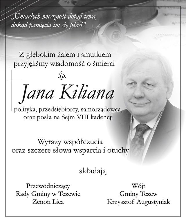 Z przykrością przyjęliśmy informacje o śmierci Jana Kiliana – posła VIII kadencji na Sejm RP, wcześniej radnego Rady Miasta Starogard oraz radnego Rady Powiatu Starogardzkiego.