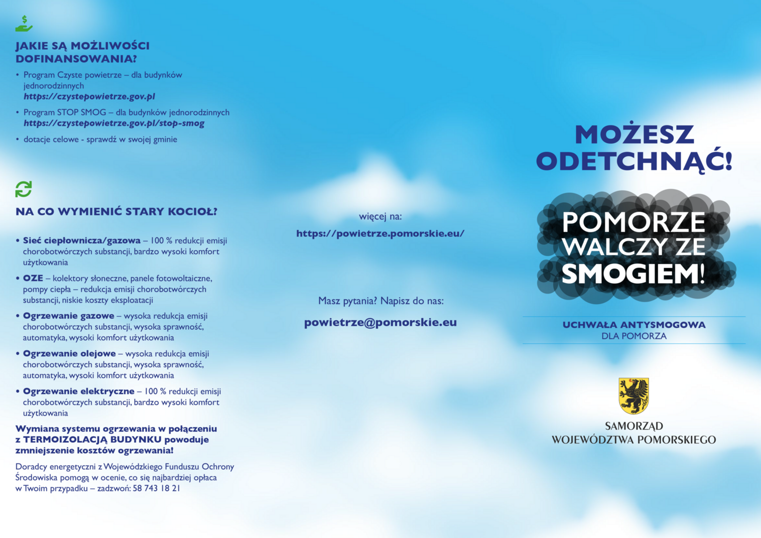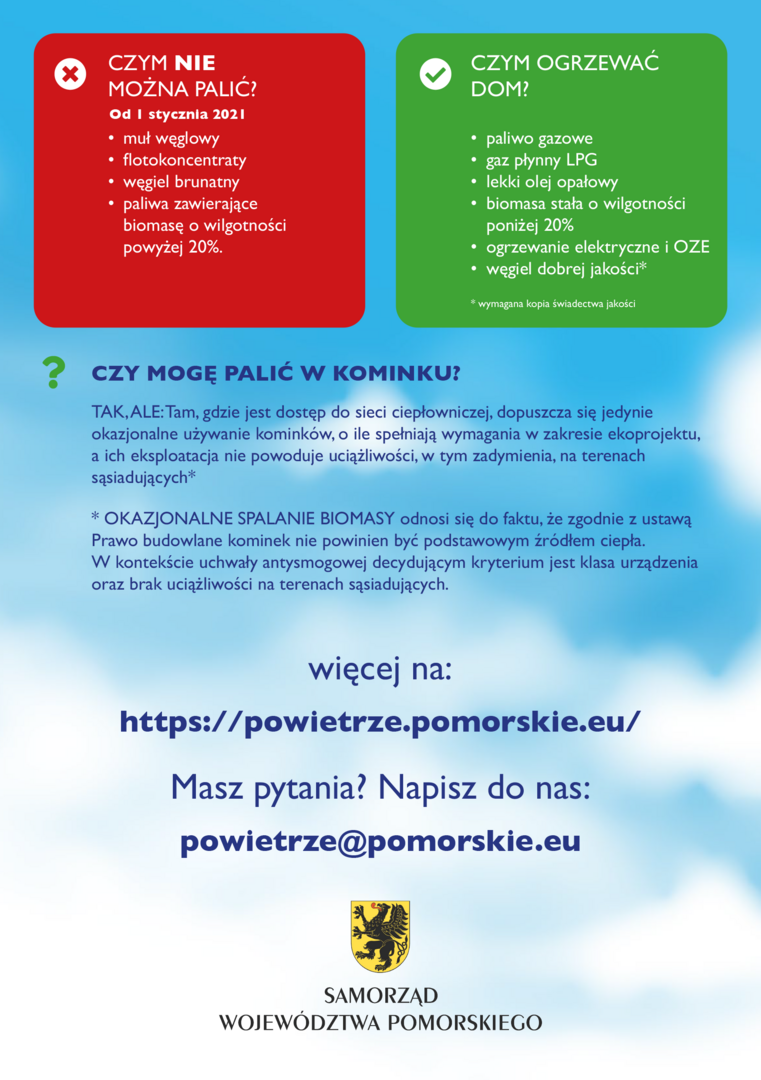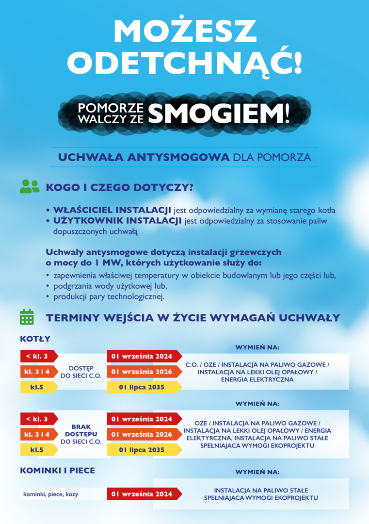 Przypominamy, że 28 września 2020 roku Sejmik Województwa Pomorskiego przyjął UCHWAŁĘ NR 310/XXIV/20 w sprawie wprowadzenia na obszarze województwa pomorskiego, z wyłączeniem Gminy Miasta Sopotu i obszaru miast, ograniczeń i zakazów w zakresie eksploatacji instalacji, w których następuje spalanie paliw tzw. uchwała antysmogowa, która ma przyczynić się do poprawy jakości powietrza w województwie pomorskim. Celem przyjętych regulacji jest likwidacja przestarzałych urządzeń grzewczych i pozyskiwanie ciepła ze źródeł niskoemisyjnych.