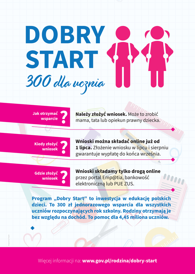 Przypominamy, że od 1 lipca 2025 r. ZUS rozpoczął przyjmowanie wniosków o ustalenie prawa do świadczenia dobry start w związku z rozpoczęciem roku szkolnego 2025/2026. W ramach programu każdemu uczniowi przysługuje jednorazowe wsparcie w wysokości 300 zł na zakup wyprawki szkolnej.