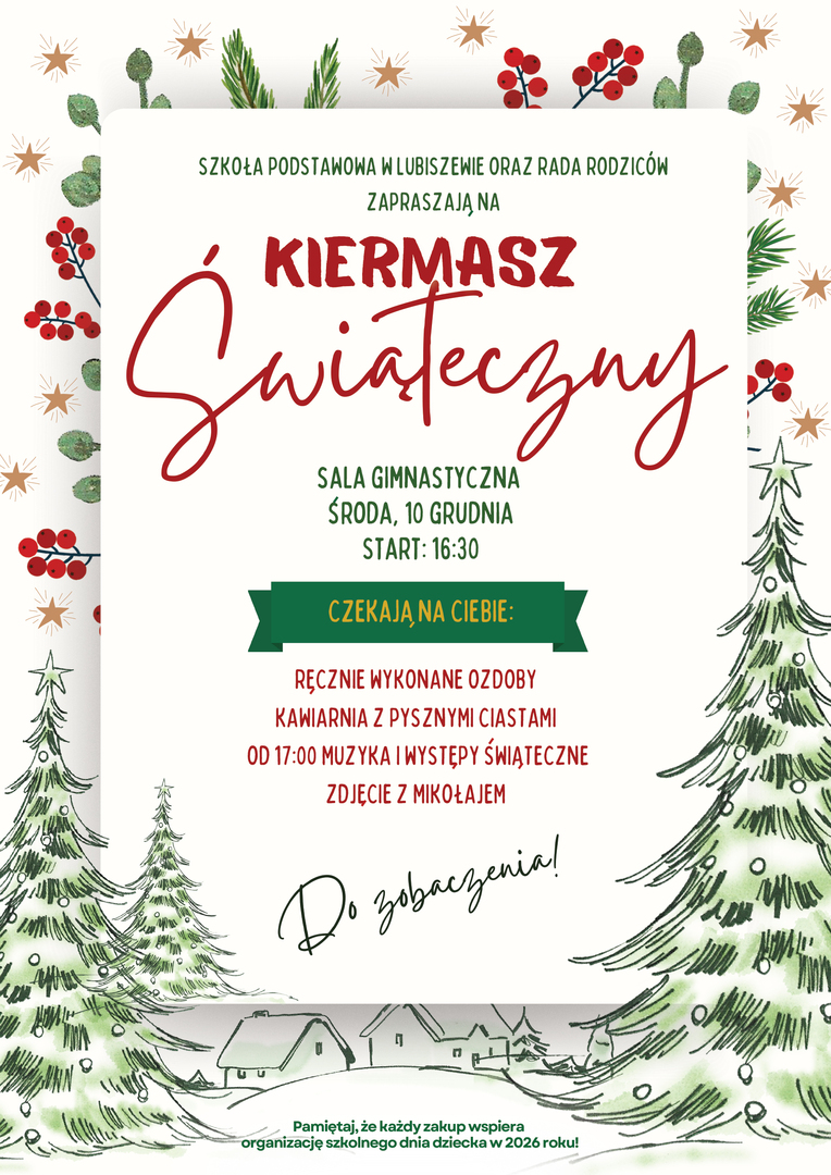 Szkoła Podstawowa w Lubiszewie wraz z Radą Rodziców zapraszają na wyjątkowy Kiermasz Świąteczny, który odbędzie się w środę, 10 grudnia, w szkolnej sali gimnastycznej.