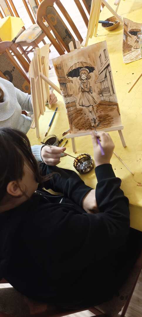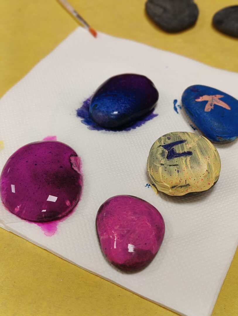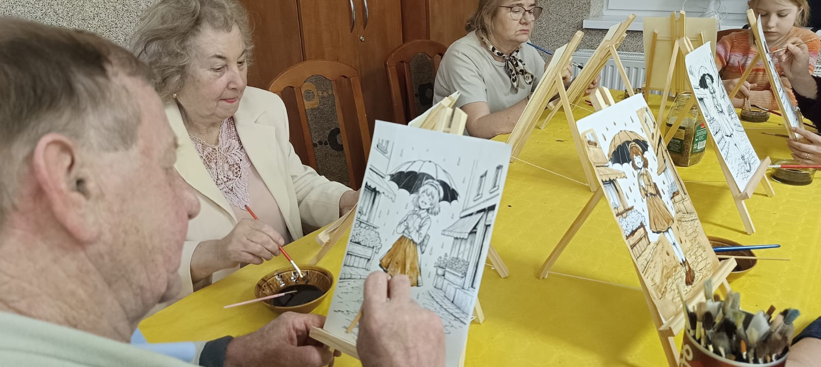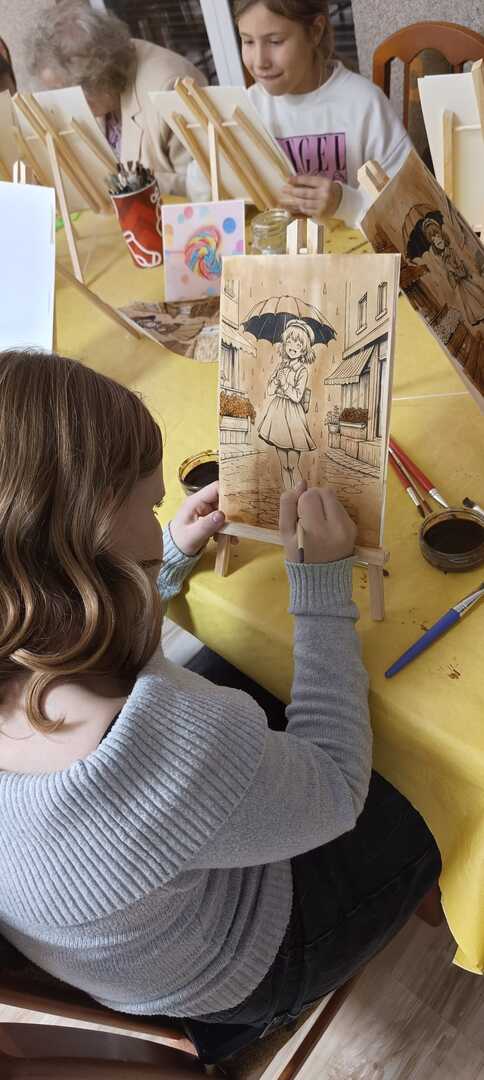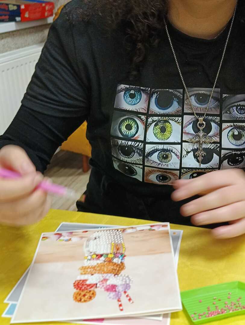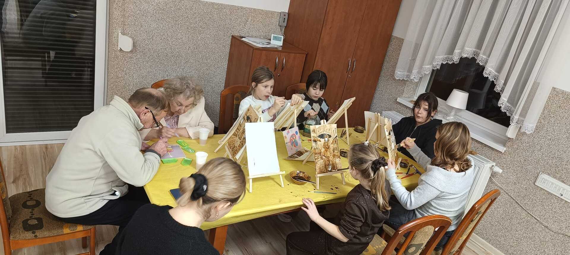 Warsztaty plastyczne przyciągnęły wszystkich – od malowania kawą, przez zdobienie kamieni, aż po tworzenie spokojnych, pełnych blasku kompozycji w technice diamentowego wyciszenia. Wspólna twórcza praca zacieśniała więzi i budowała sąsiedzką atmosferę.
